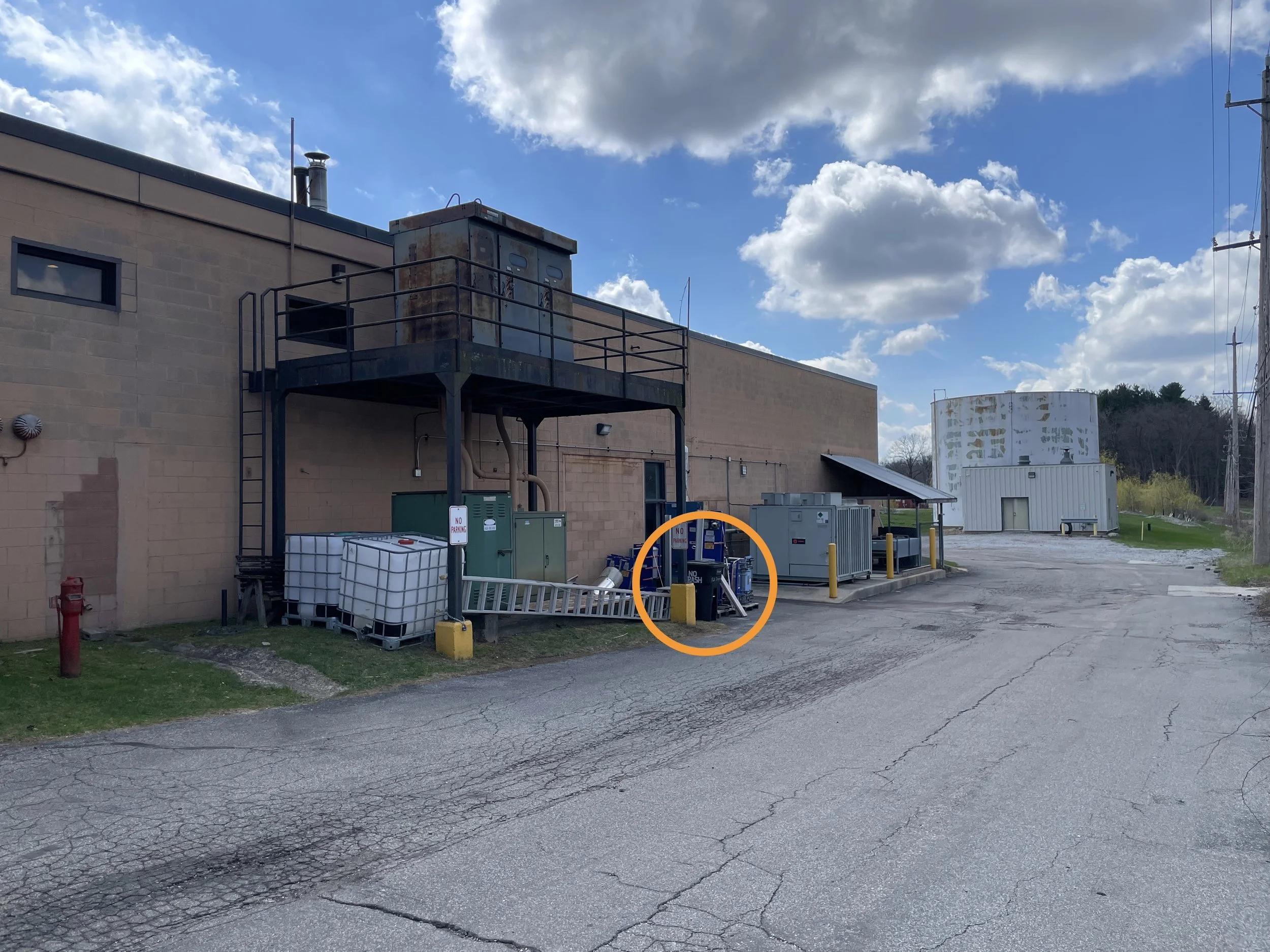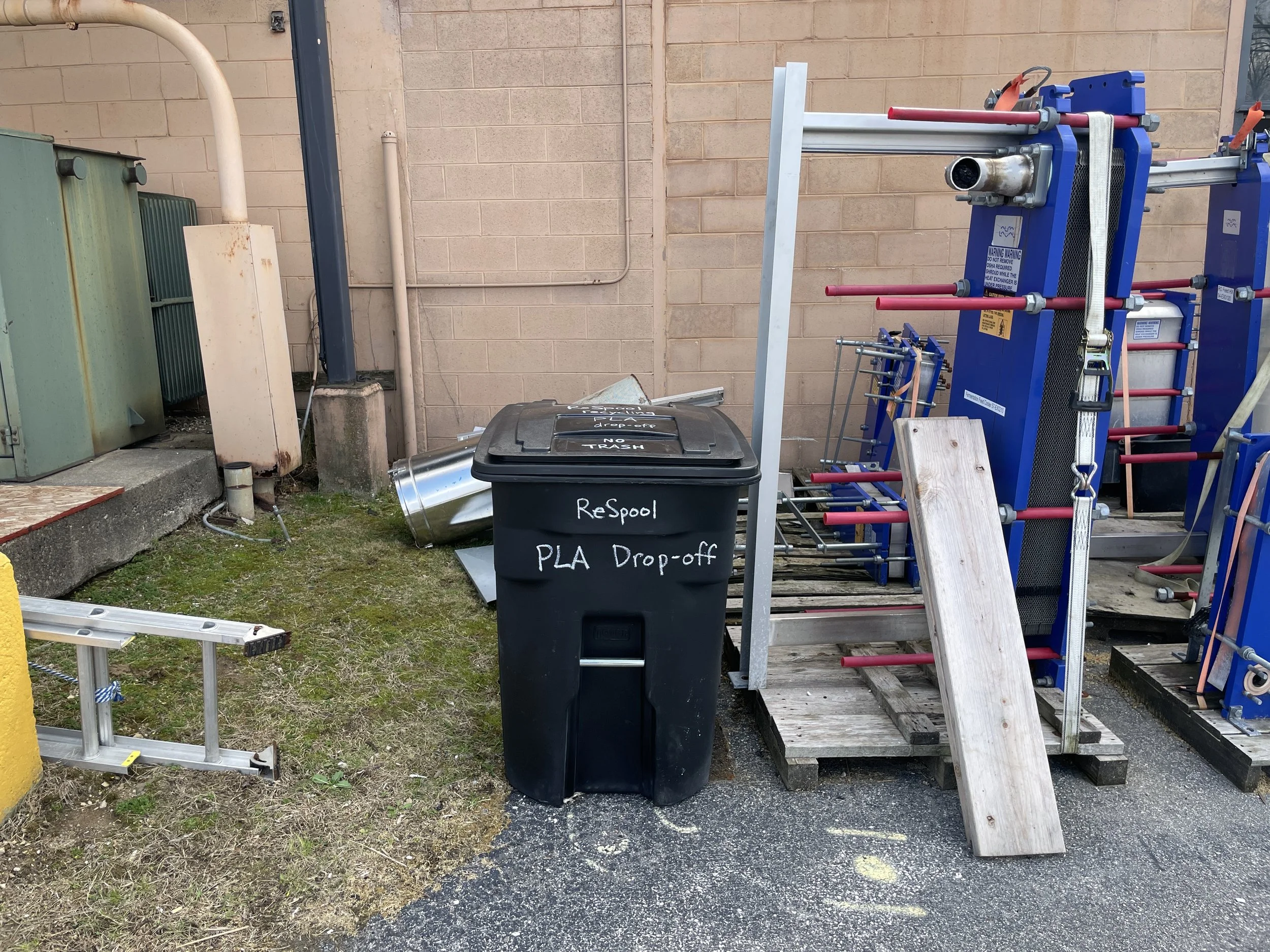 Turn off Wagner Rd. along the north side of MI-HQ building 1. Look for the black bin. Deposit your empty spools and bagged or boxed PLA waste inside.